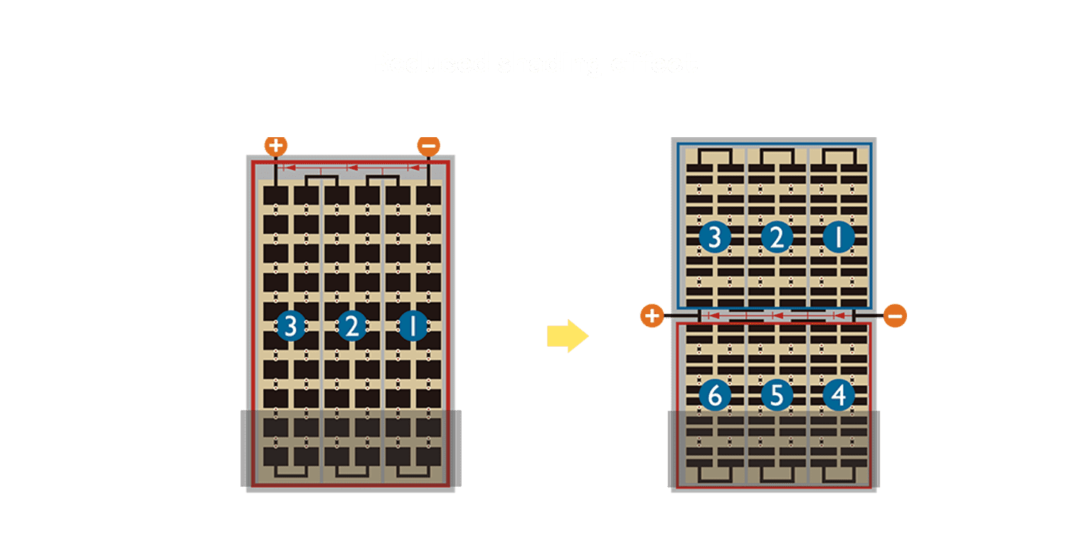 - 结合半切电池,,,,降低遮阴影响、、、提升模组抗隐裂能力、、并减少电阻损耗,,,进一步提升模组发电效能。。