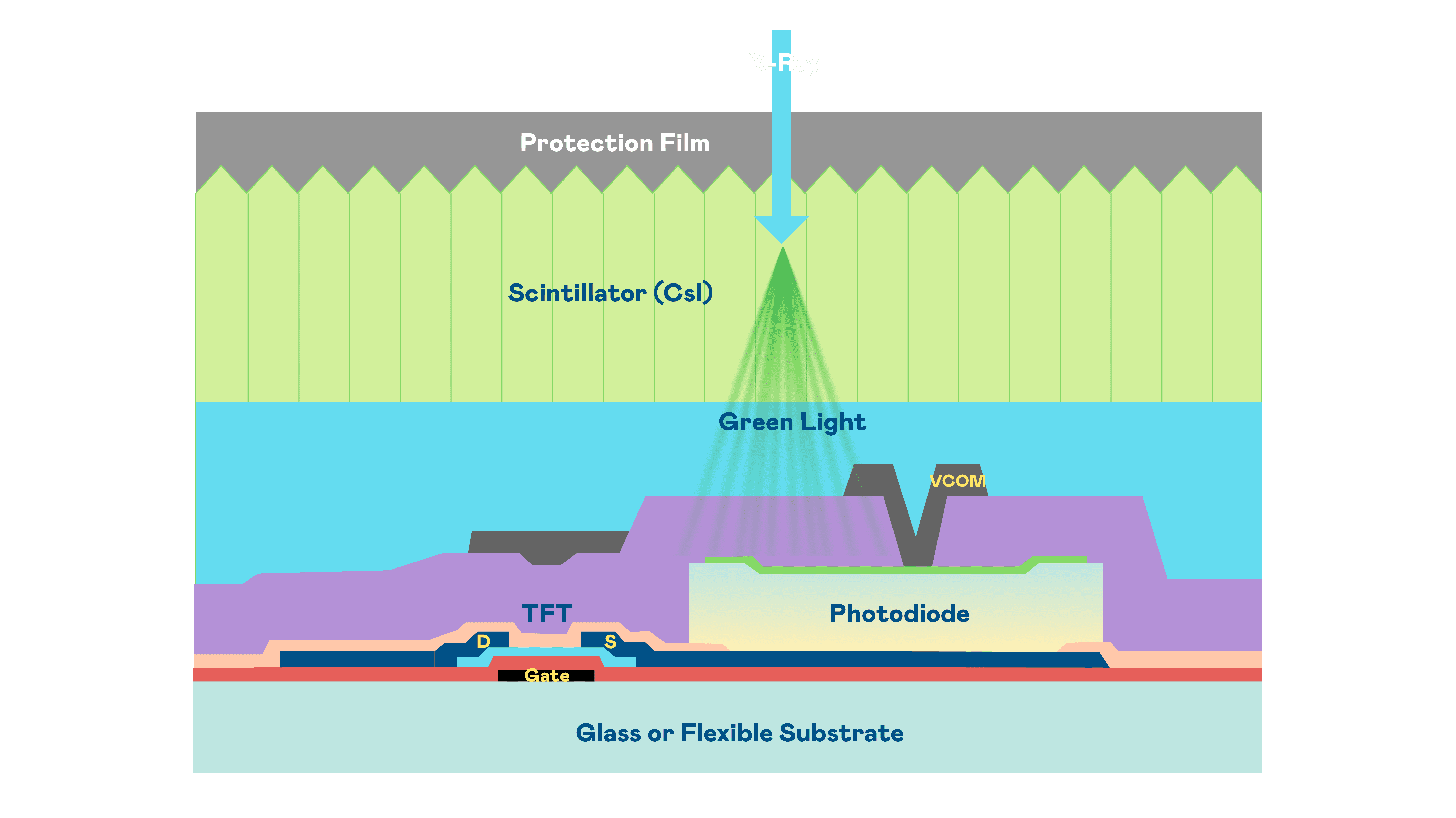 PA直营的X光影像感测阵列使用薄膜电晶体 (TFT) 作为每个像素的读取开关,,,,搭配光电二极体(Photodiode)的光电转换元件,,,,用以感测X光影像讯号。。。。